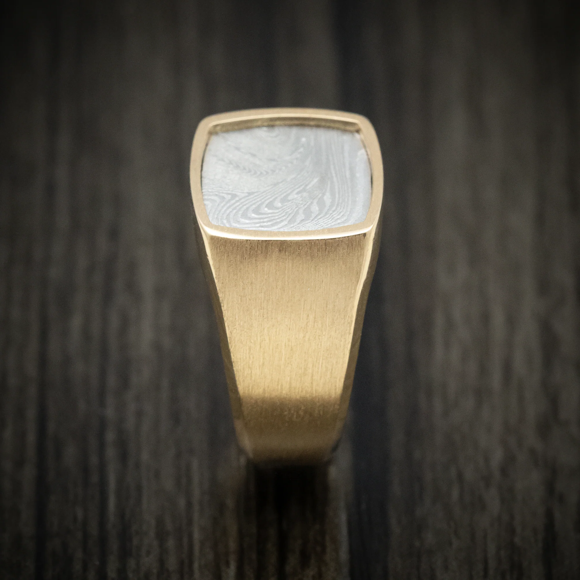14K Gold and Tightweave Kuro Damascus Steel Signet Men's Ring Custom Made Band