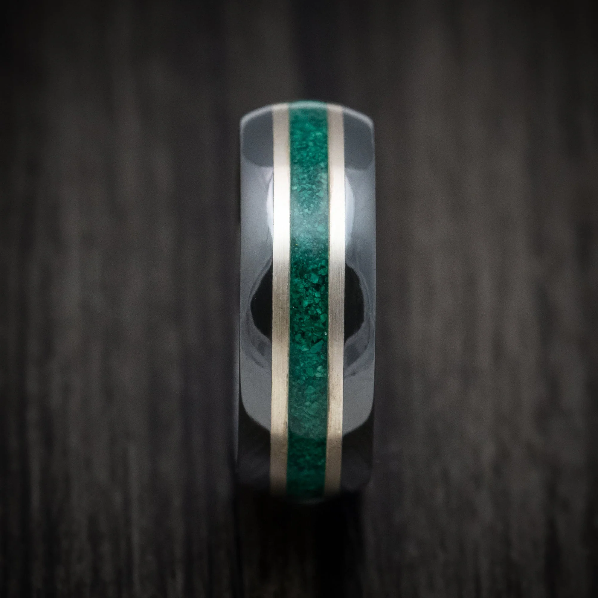 Black Titanium Men's Ring with Silver and Malachite Inlays Custom Made Band