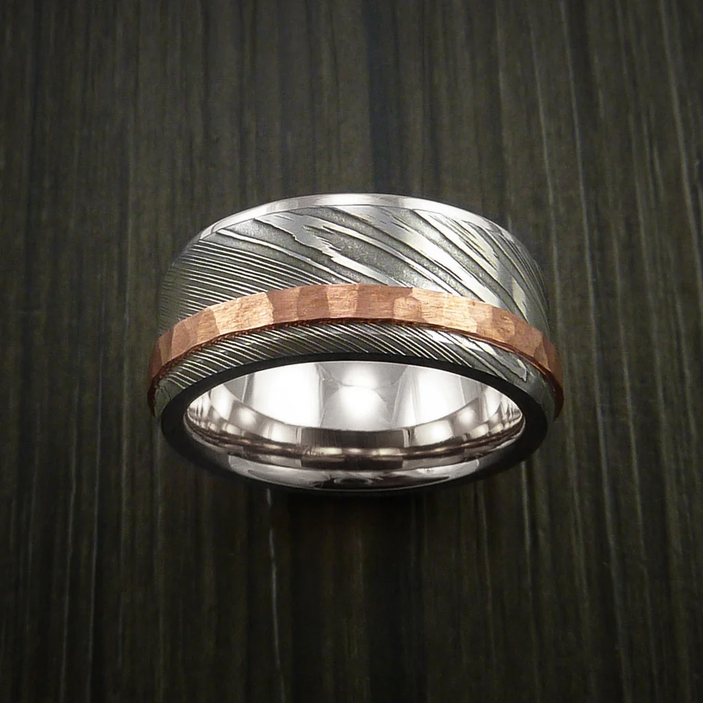 Damascus Steel 14K White Gold Men's Ring Wedding Band with Hammered Copper Inlay