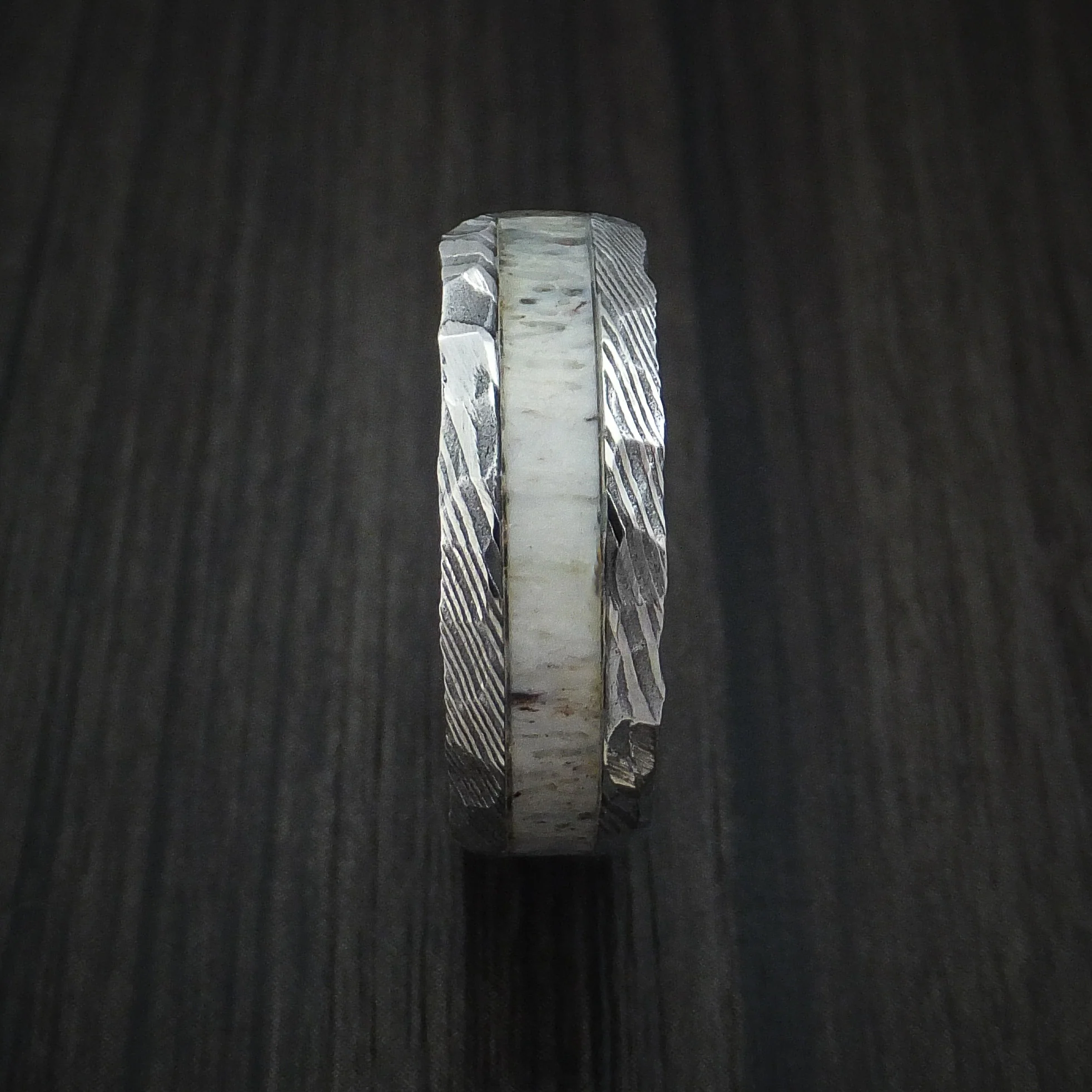 Damascus Steel and Antler Rock Hammered Men's Ring Custom Made Band