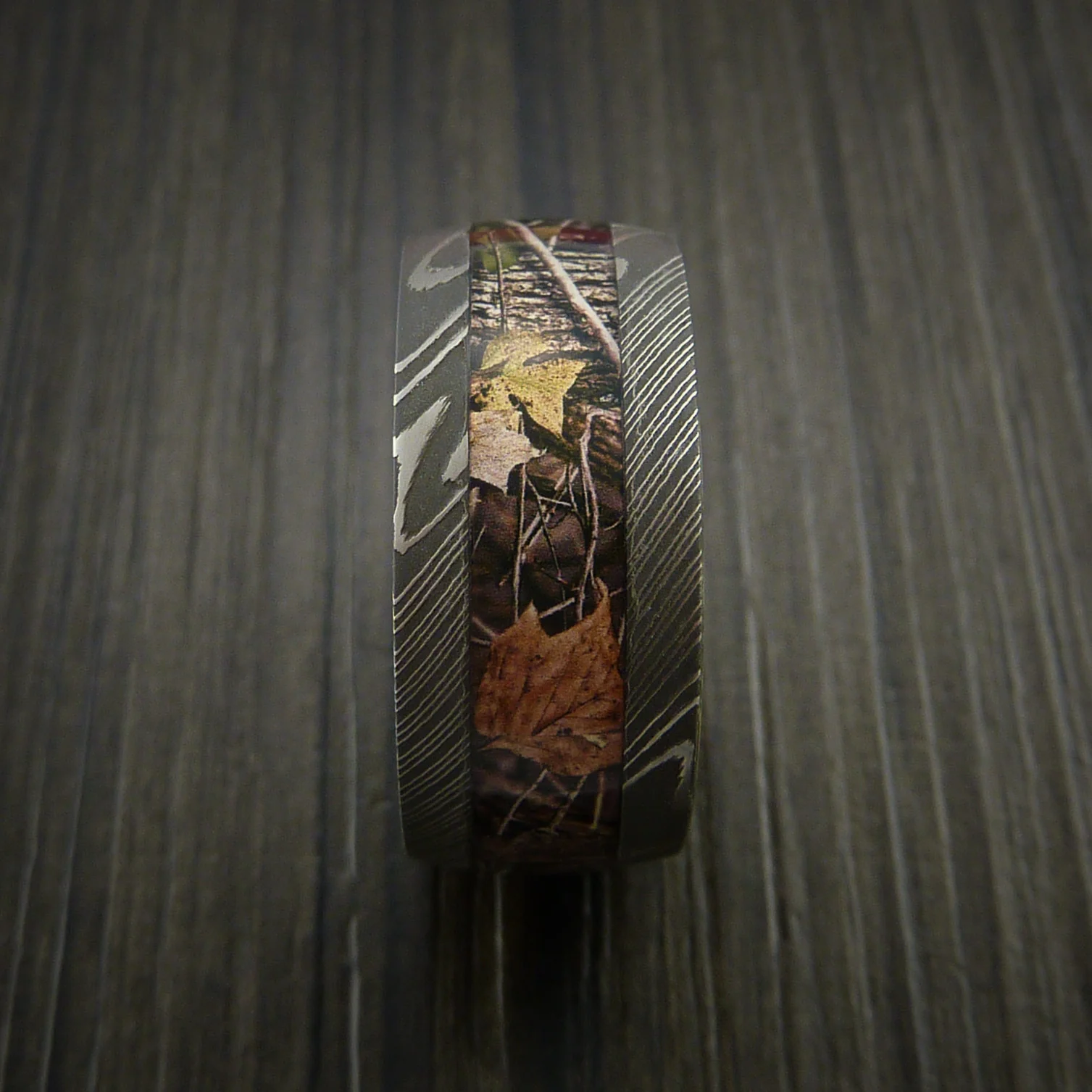 Damascus Steel Men's Ring with Camo Inlay Custom Made Wedding Band