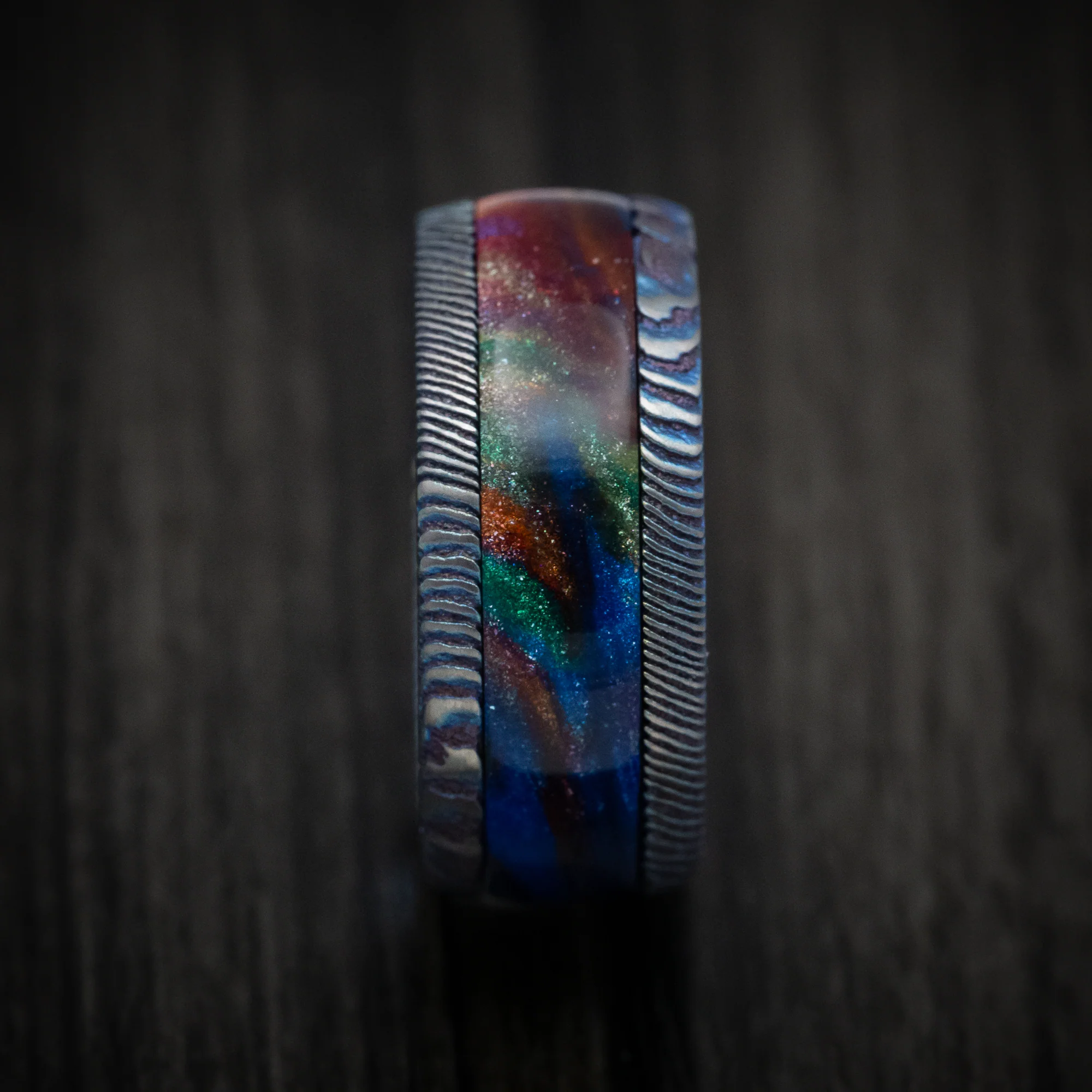 Kuro-Ti Heat-Treated Titanium Damascus and DiamondCast Inlay Men's Ring Custom Made—