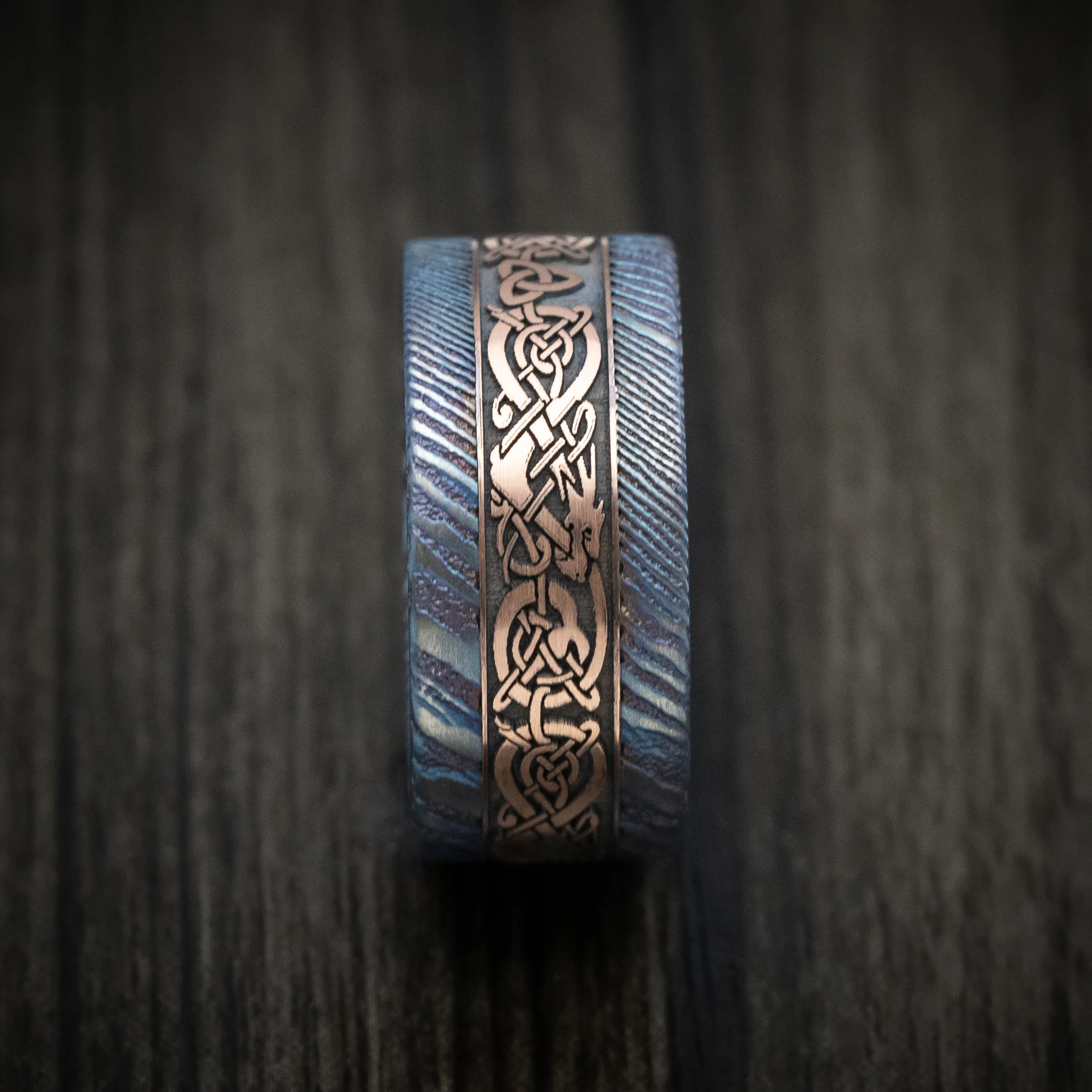 Kuro-Ti Heat-Treated Titanium Damascus and Gold Celtic Dragon Custom Men's Ring