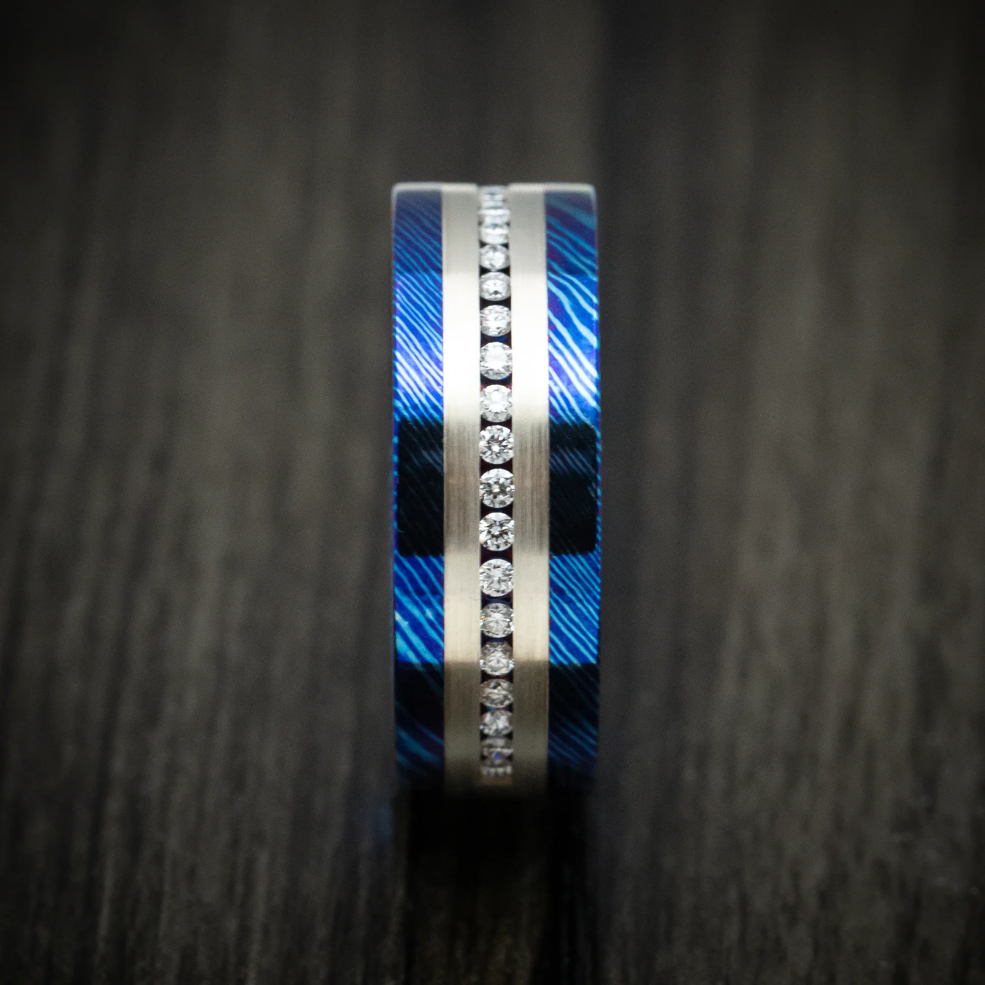 Kuro-Ti Heat-Treated Titanium Damascus Men's Ring with Silver Inlay and Half-Eternity Lab Diamonds Custom Made Ring