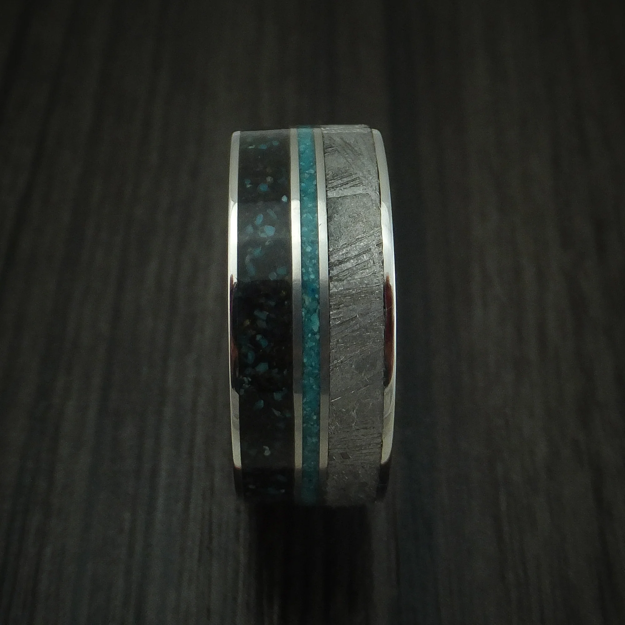 Titanium Black Dinosaur Bone with Turquoise And Gibeon Meteorite Men's Ring Custom Made Fossil Band
